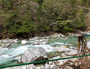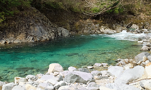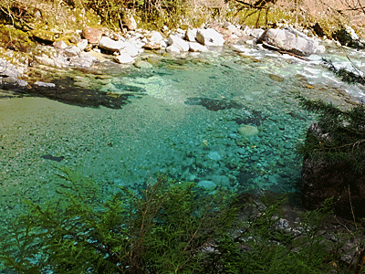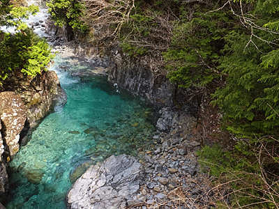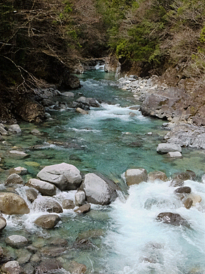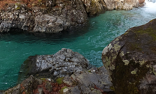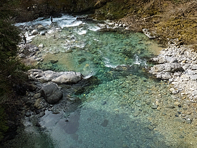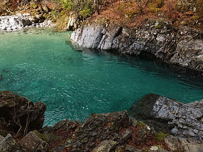 | 今回で3回目の阿寺渓谷だが、 いつ見てもこんなに澄んだ青色 「サファイアロード」という名前が付くのも道理 |