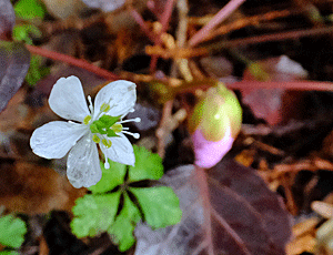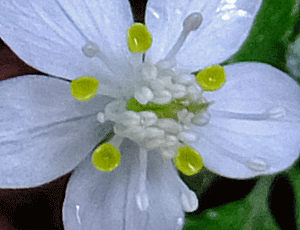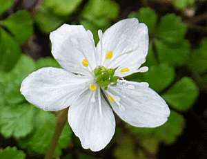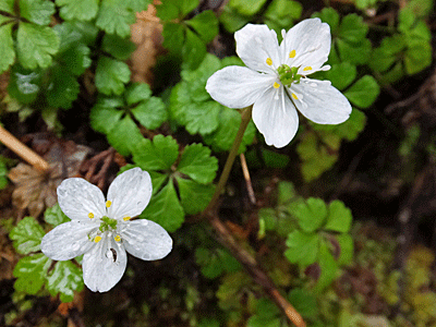 | ゴヨウオウレン:キンポウゲ科 バイカオウレンともいう ゴヨウ(五葉)と覚えると分かりやすい 左 花びらのように見える白い部分は、萼 本当の花びらは、緑色のスプーン状の部分 白い綿棒のような部分は雄しべ 薄紫色もある 中央に雌しべがあるが、はっきり写っていない 右 花びらが黄色になってきた 中央の雌しべは、角状に大きくなってきた 雄しべはみんな白色になってきた |