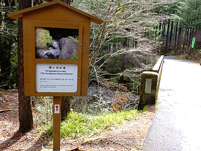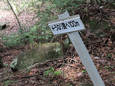 | 渡り終えてからはジグザグで下へ下へと下りて行くが 道や石が濡れているので用心して歩いた やっと川べりに出て、たらたら歩いて行くと、 こんな標識 あと少し |