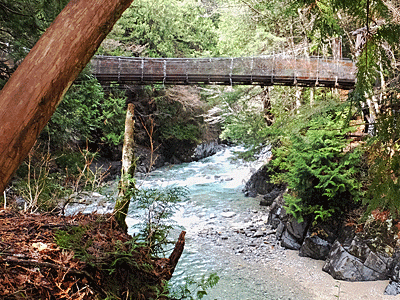 | ↑ この吊り橋は、「赤彦吊り橋」 濡れていると滑りそうで、1歩1歩慎重に歩いた |