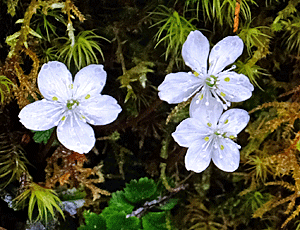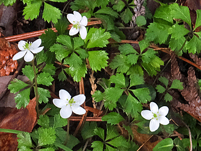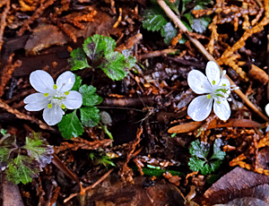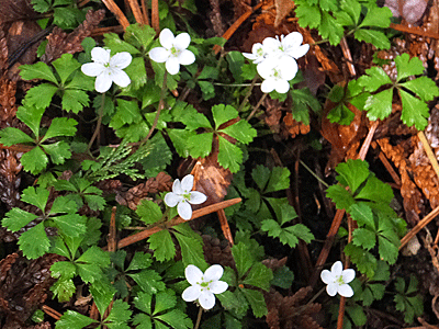 | ↑ ゴヨウオウレン:キンポウゲ科 川岸のあちこちに小群落 |