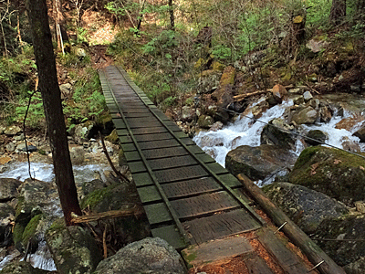 | この橋も濡れていたので恐々歩いた 手すりは無く、細い鉄線だけ |