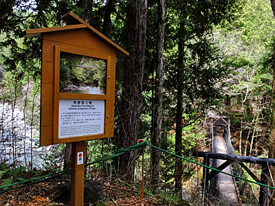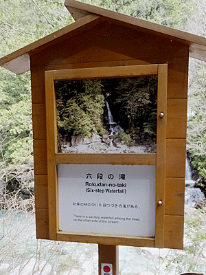 | 「六段の滝」の説明板 ちょうどこの後ろにその滝が見えるが、 ここから眺めると六段になっているのだろうか?? |