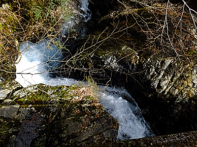 | ↑ 「樽ケ沢の滝」 橋の上から下流を覗き込むと ぐにゃりと曲がって勢いよく流れる滝が見える ↓ |