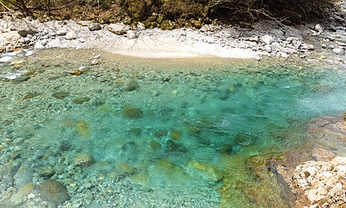 | 河原に下りた ここもい〜いエメラルドグリーン |