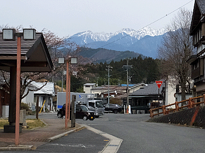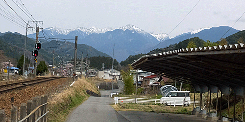 | ↑ 野尻駅に着いた 12:54 左から、麦草岳・木曽前岳・木曽駒ケ岳 13時台はは無し! 14:30まで待つ羽目 下調べが不十分だった・・・ |
