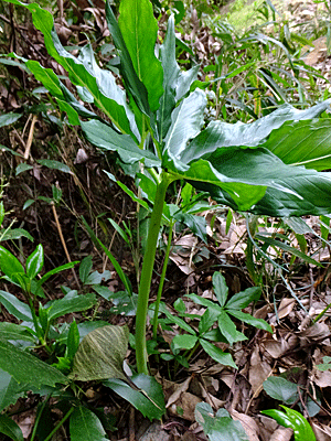 | 太い部分が、いわゆる『偽茎(ぎけい)』 (茎のように見えるが、葉っぱの仲間) その先がくるっと曲がって葉っぱに分かれているように見える |