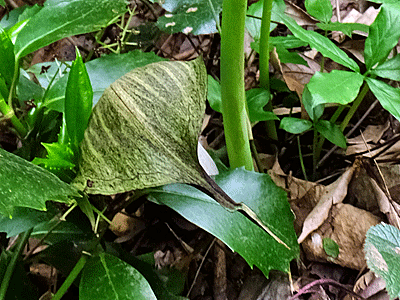 ↑ 結局この株の下にある芋が年々大きくなっていくのだろうが、 大きくて花が咲いていたのは、去年も今年もこの一株だけ 周りに小さい葉っぱの子どもがたくさんいたので、来年はどうなるかな? ・・・・・・・・・・ 継続観察が必要・・・ 枯れる前に、中を見てみたい スルガテンナンショウとどこが同じで、どこが違うかが課題 |