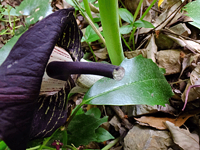 | ウラシマソウ:サトイモ科-3 中はどうなっているんだろう? そっと先端を持ち上げてパチリ ↓ |