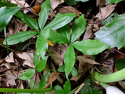 | ウラシマソウ:サトイモ科-1 4月4日に偵察に行った時は、何の気配も無かった その後、花友達から、「咲いていたよ〜」の連絡 慌てて、18日に見に行った が、その日はカメラ無しだったので、咲いていることを確認しただけ カメラを持って、20日に再度 もうこんな立派な葉っぱ!になっていた 直径30cm程 この葉っぱ、これで1枚だって その1枚が『鳥足状』になっているので 正式には『鳥足状複葉』と言われている (*なぜこれが鳥の足なのか分からな〜い!) ↓ 葉っぱの中心部を拡大してみた |