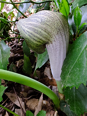 | ウラシマソウ:サトイモ科-2 横から見てみた 立派な太い茎!(偽茎) その根元から先がとがっていて、茶色の筋のある ぽっこりしたものが見えた ↓ 拡大してみた |