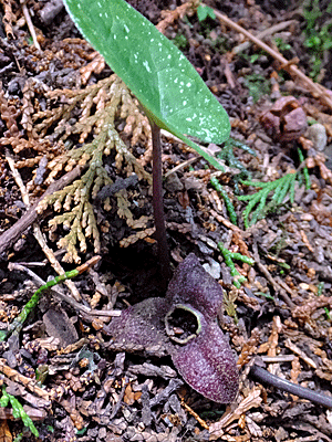 | スズカカンアオイ:ウマノスズクサ科-2 こちらは赤っぽい花(普通はこんな色が多い) どちらも地面の上に顔を出していた |