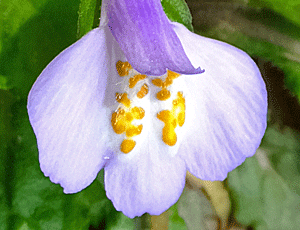 | ムラサキサギゴケ:サギゴケ科 上 匍匐枝(ほふくし=ランナーともいう)で、どんどん横に広がっていく 下左 葉の間から匍匐枝が伸びている 下左 下唇の中央は盛り上がっていて、黄色い点々がある |