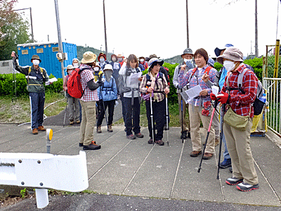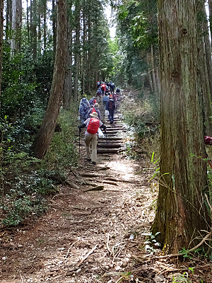 | 前半グループ 全員が座れるベンチも無いので、 撮影後すぐ出発 13:45頃 次の全員集合場所は宮苅峠 先頭グループの姿なし 最後の数名にショートカットコースを下るように指示 (こちらの方が楽) |