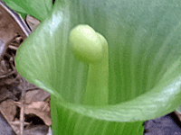 | スルガテンナンショウ:サトイモ科 ぺろりと垂れている部分は、「仏炎苞(ぶつえんほう)」 前を歩いて行った人が、中が見えるように めくっておいてくれたらしい フツーは垂れていて中は見えない 中を覗くと白い棒の先端は、丸くてくびれている 多治見近辺には、こういう特徴のテンナンショウが多い |