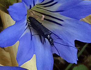 | ハルリンドウ:リンドウ科-5 虫がやってきた 体に花粉を付け、同じ花か? 或いはちがう花の雌しべにくっつける役目だろうね |