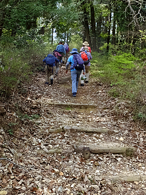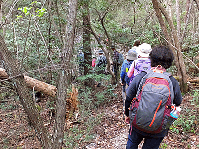 | 通学路をささっと歩いて細い山道へ ここの分岐は分かりにくいので、 全員が揃ってから歩き始めた |