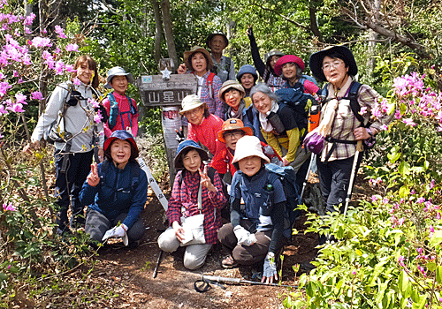 | やっと山頂到着〜 13:30 全員で写真を撮ろうとしたが 、周りのツツジが邪魔で(無いと寂しい・あると華やか) 上手く撮れないので、半々に分かれた 前半グループ |