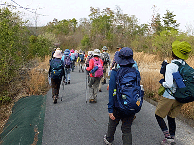 | 舗装路に出たところで立ち休憩していると 変わったものが目に入った これも初めて見た テンナンショウの仲間のように見えるが、芽出しの様子が違う 太くてがっしりしていて。なんだろうと思いながらも まずはランチ休憩のできそうな宮苅峠まで行こうと思った 「地図を見て、あと何分で峠に着くと思う?」と 経験豊富な人に聞いて見ると、 「30分くらい」という返事 30分なら頑張ろうと思って出発 宮苅峠へおよそ30分で着き やっと段差や階段で座ってランチ |