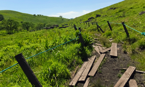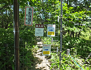 | 鹿避けの「開けて・閉めて」のフェンス柵 10:54 上下2段になっていた 下の段だけ明けても通れるが かがんで入らなければならない |