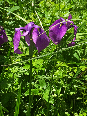 | ヒオウギアヤメ:アヤメ科 ヒオウギアヤメは『湿地や湿った草地に原生する・花茎が分枝する』・・・と アヤメはあちこちで咲いていたが、 ヒオウギアヤメは一ヶ所だけだった それにしても、鮮やかな色!背も高かった~ |