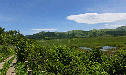 | 木道をどんどん歩いて行くと、 小さな池があった 遠くに変わった形の大きな雲 下山するまで、じっと同じところに浮かんでいた |