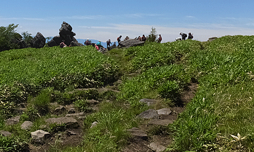 | 物見岩に着いた 12:56 大勢の団体さんたちが休んでいた 北関東からの「市民登山」で、50名だって これから八島湿原経由で帰るって |
