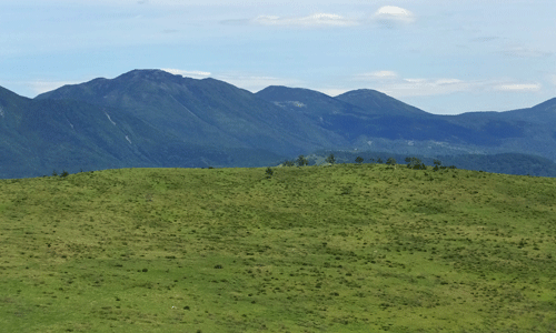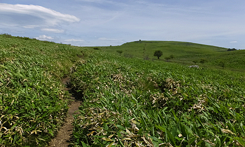 | 笹原がずっと続いている やっぱり花は無し 中央当たりの稜線にぽこんと丸いドーム 車山の山頂 ずいぶん遠いなあ・・・ |