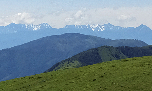 | こっちは北アルプス 中央右寄りのツンと尖った山が、「槍」 そこから左へ見ていくと、 ぐんと下がってからそびえるのが、「北穂」かな? 何度も何度も後ろを振り返っていた 花はないけれど、展望がいいので、ま、いいか・・・ |