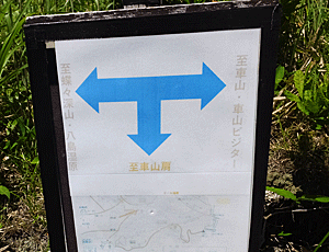 | 簡易標識 (地図が薄くて見えない~) 14:12 ここを右折すると、「車山肩」へ 車山山頂から下りてきた団体さんには、 ここを曲がるように・・・とアドバイス |