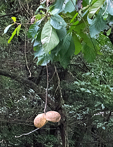 | アケビと思う:アケビ科 遠くの方にぶら下がっている実を見つけた この形は多分アケビ 足元に落ちている 中身のないアケビの実もたくさんあった |