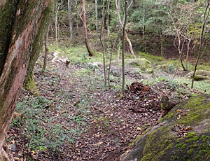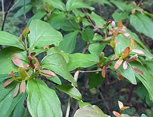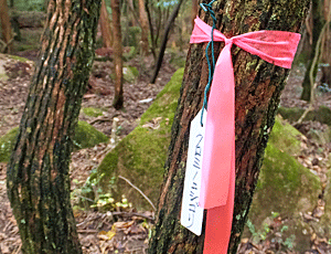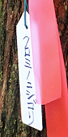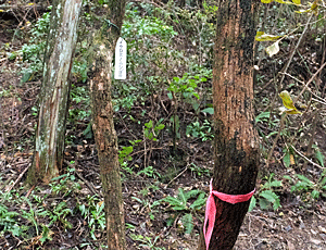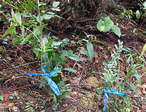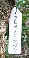 | 渡ってみると、まだ新しい赤いテープのついている木が あちこちにあった 何と書いてあるのか調べると「クロミノニシゴリ」 聞いたことはあるが、 すぐにその木の花や実が思い出せなかった・・・ |
