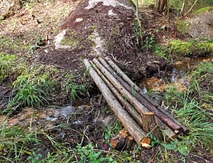| おっ、ここにも木橋 ここには「通行止め」の札が無かった・・・ そろり〜と渡らせてもらって対岸へ |