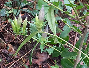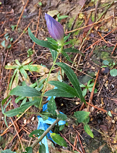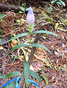 | リンドウ:リンドウ科 元の遊歩道へ戻ってくると こんなふうにテープが巻き付けてあった この意味は、 踏まれないよう・刈り取らないよう・・・の印 今度は青いテープだった 一ヶ所だけではなく、 周りを見るとあちこちに青いテープが付いていた 近づいてじっくり見ると、リンドウの花だった 花の色が薄いので、目に入らなかった・・・ 今日、ここへ来ようと思ったのは、 このリンドウとセンブリが咲いているかも・・・と思ったから 会えてよかった〜! |