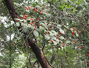 | ウメモドキかな?:モチノキ科 足元に赤い小さな実がいっぱい落ちていた 上を見上げると、この木 こんなに背が高くなる?? |