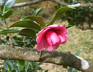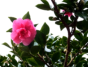 | ツバキの仲間:ツバキ科 今頃咲いている・・・季節を間違えたのか?と思ったら いっぱい蕾があったので、 せっかちさんだった |