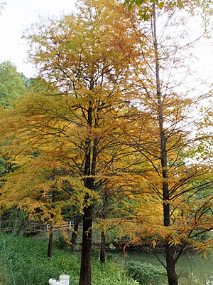 | メタセコイア:ヒノキ科-1 ここは、池から離れているので、呼吸根は見られなかった =すなわち「メタセコイア」 ↑ 見事な黄葉! |