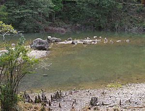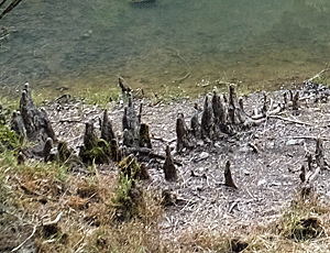| ↑ 秋葉溜池 こんなに水が少ないことは初めて 左 手前ににょきにょき出ているのが、呼吸根(右拡大) 水の中だけでなく、岸辺近くにも出る この呼吸根が出るのは、メタセコイアそっくりの 「ヌマスギ」 |
