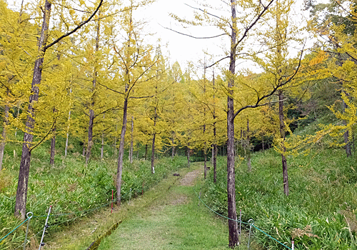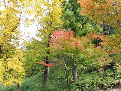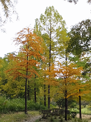 | 黄色=メタセコイア:ヒノキ科 赤っぽい葉=カエデの仲間:ムクロジ科 |