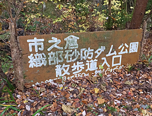 | 織部砂防ダムから流れる小川に降りていくと、 こんな立て札 「散歩道入口」だって |