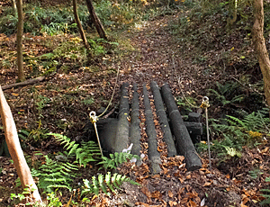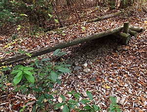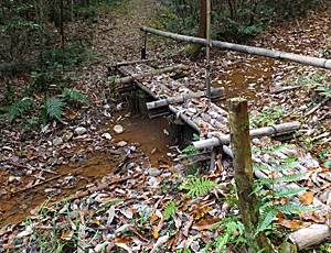 そのすぐ下にある堰堤には、 水が少々流れて込んでいて そこから流れれ出るr小川には、少々の水 竹製の橋を渡り、対岸へ |