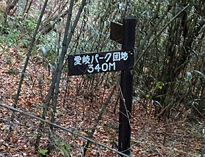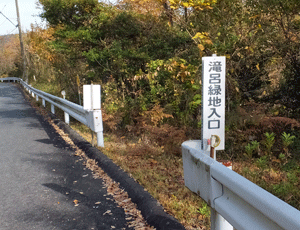 左折して舗装路を歩いていくと、 「滝呂緑地入口」の看板 ここから右折して降りていくと・・・ |