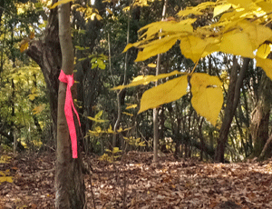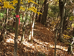 後は道なりに降りていけば、 滝呂緑地に入らずに 車道へ下りられる この赤いテープが、出口の印 |