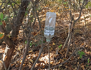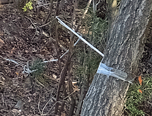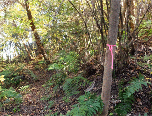 今日の下見の目的は、 以前のようにぐるりと周回できるかどうか 水道タンクを右に見て山の中へ 赤いテープがあった こういうテープがある所は、 「こっちへおいで〜」という意味 |