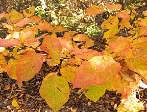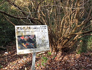 | マルバノキ:マンサク科 この滝呂緑地のここだけに、大きな株立の木がある 説明板は汚れていて、年月を感じさせられた 「ベニマンサク」ともいわれ、きれいな紅葉になるのだが、 すでに遅し 葉は落ちてしまったか、茶色の枯葉になっていた・・・ |