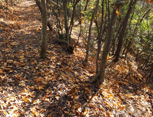| 稜線伝いにヒョウタン型の山道を 左へ左へと入っていく ずっと以前、 同じような山道を気なしに歩いていたら 堂々巡りになってしまったことがあったので、 それ以来、注意して歩くようになった |