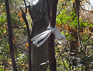 が、今日はこんな白いビニールが まきつけてあった このT字路、左へ行くと「お地蔵様」 右へ行くと鉄塔がある 今日は右折 |