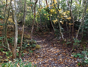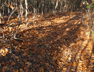 | 最近は歩く人が少なくなったのか 踏み跡が所々不明瞭になる場所もある 上へ上へと登っていくと、T字路に出る なんの標識もないので ここを下る場合は要注意 |