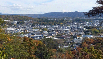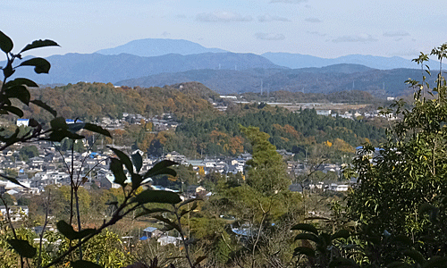 | 左 左手に笠原の町が見下ろせた 右 笠原庁舎・体育館・モザイクタイルミュージアムも 小さく見えた |