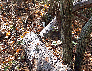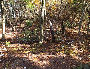 | 左上がダメなら、右下はどうか・・・と思ったが 踏まれた跡が見つからない この白いテープ、以前来た時は 新品で延々と稜線と、稜線の下に 張り巡らされていたが 今日は擦り切れてちぎれてしまっていた で、右下なら道が続いているかもと探したが 大勢で歩けそうな場所は無し |